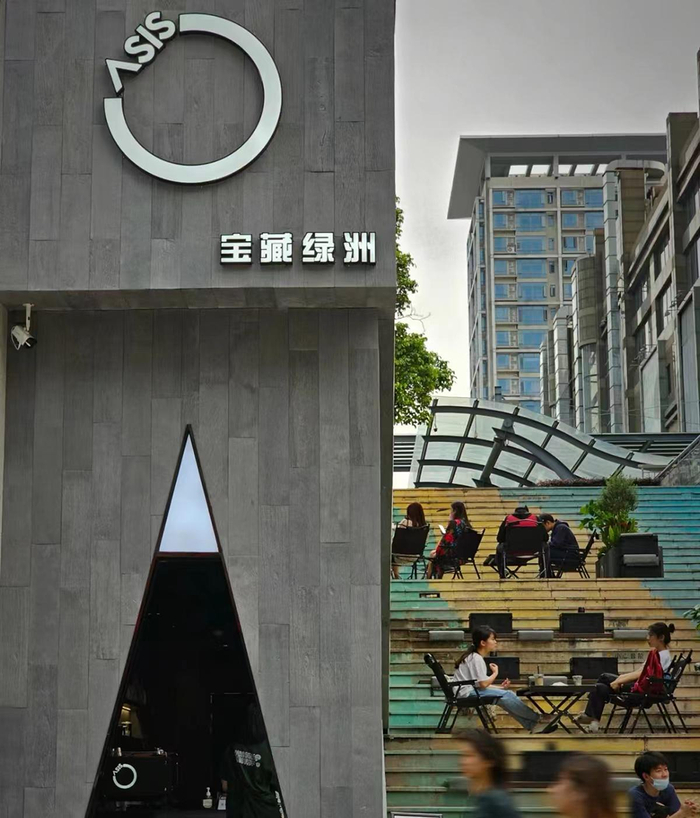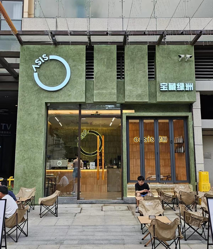 宝藏绿洲,创立于广东江门,与喜茶是老乡。主打一店一设计,每家店都标示性极强的视觉冲击,但又有统一的简约风格。东莞汇一城店,三角形的门,搭配露天的阶梯式座位区;广州六运小区店,主打“铁锈风”,乍看厚重突兀,但辨识度很强。