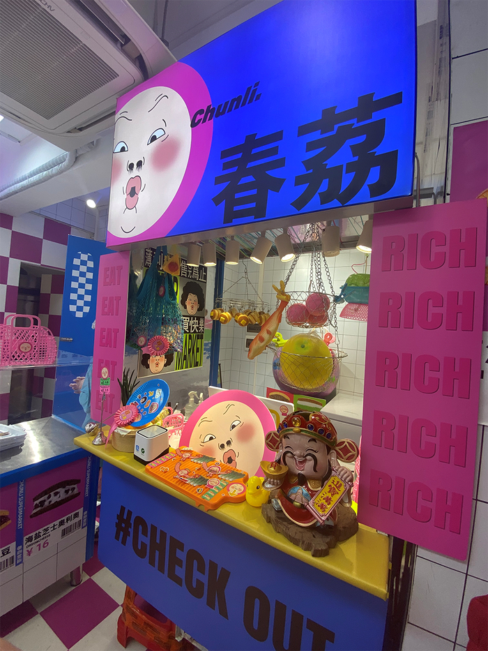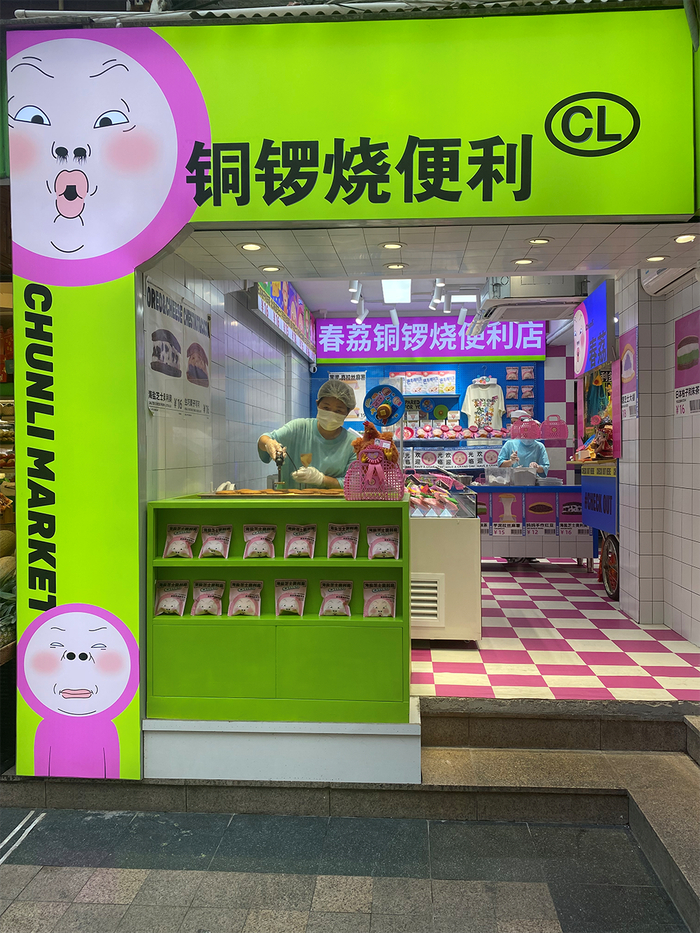 春荔铜锣烧便利店,2023年开进广州六运小区。搞怪丑萌IP人物+嫩绿色店招,于一众网红店中脱颖而出。装修风格很“多巴胺”,丰富色块交错吸睛。“便利店”形式,消费者可自主选购,店内设有各种打卡点,就连收银台也是各种混搭元素激发好奇心。