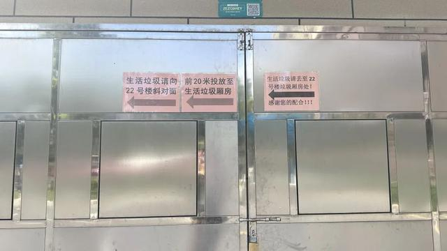 记者发现,这间垃圾厢房的门口贴了告知单,只要有人靠近,垃圾厢房外墙上安装的广播还会提示居民“不要在此丢垃圾”,并告知向前20米左右就有开放的垃圾厢房。
