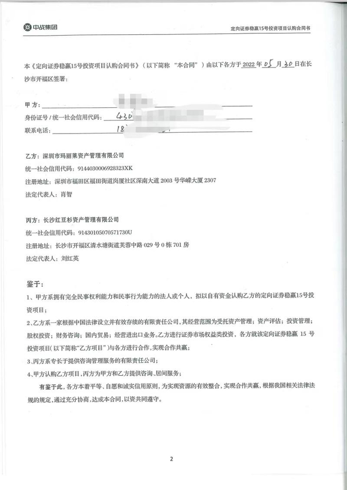 湖南投资者朱娟告诉澎湃新闻,2022年5月,她与深圳市玛丽莱资产管理有限公司和长沙红豆杉资产管理有限公司签订了三方合同,认购了“定向证券稳赢15号投资项目”,投资100万给乙方深圳玛丽莱用于证券市场权益类投资,2年到期,业绩比较基准为15.5%,约定到期总收益为31万元。此合同签订当日还签订了一个补充协议,中战集团对朱娟债权的实现提供无条件不可撤销的连带责任保证。