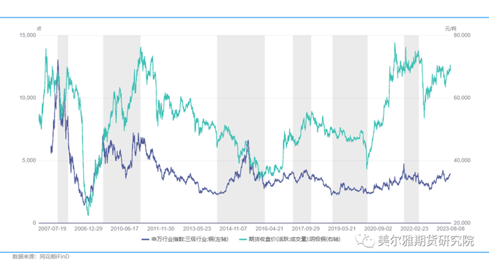 (1)在上涨趋势顶部阶段,铜铝股价也领先或同步于期货见顶,例如2007.10、2009.7、2017.3、2021.9等四个上涨周期顶部,铜和铝的股票指数率先构建顶部,随后分别于6-12个月铜铝期货价格见顶。同时,铜铝股票和期货的价格通常为圆形顶,即难以出现倒V型顶,或许与宏观需求在惯性作用下难以快速扭转有关。