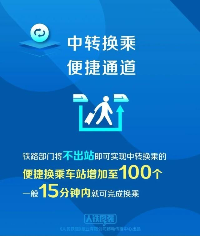15分钟内换乘,时间够用吗?当然!目前,铁路部门将不出站即可实现中转换乘的便捷换乘车站增加至100个,站内开辟便捷换乘通道,免去旅客先出站、再安检进站的麻烦。
