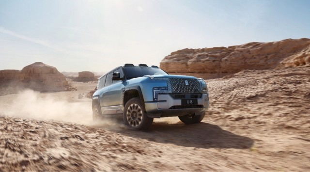仰望U8定位为百万级硬派越野SUV,车身长达5319mm,宽2050mm,高度达1930mm,轴距达3050mm。外观方面,U8采用了仰望品牌“时空之门”的家族式设计风格,将未来感和科技感融入到整车的设计,整体造型十分前卫硬朗。