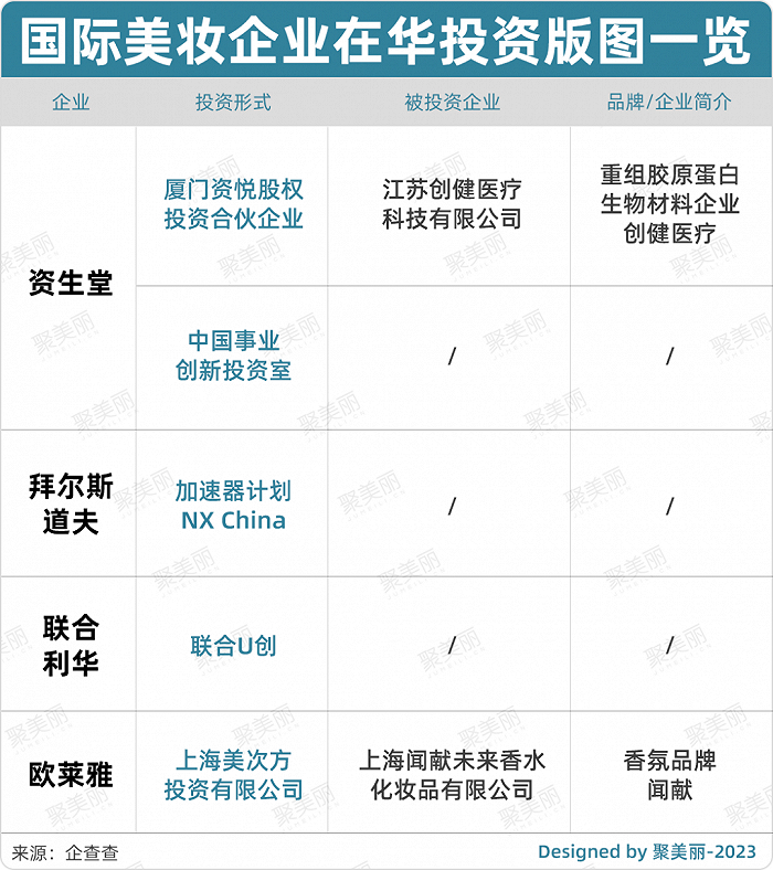 比如,2019年资生堂设立中国事业创新投资室的时候,便提出“探索深度参与本土创新的战略路径”,2022年成立规模达10亿的厦门资悦股权投资合伙企业,并直接点名,将重点聚焦美妆、健康等前沿市场新兴品牌及上下游相关技术服务公司的投资机会;目前已投资重组胶原蛋白生物材料企业创健医疗。