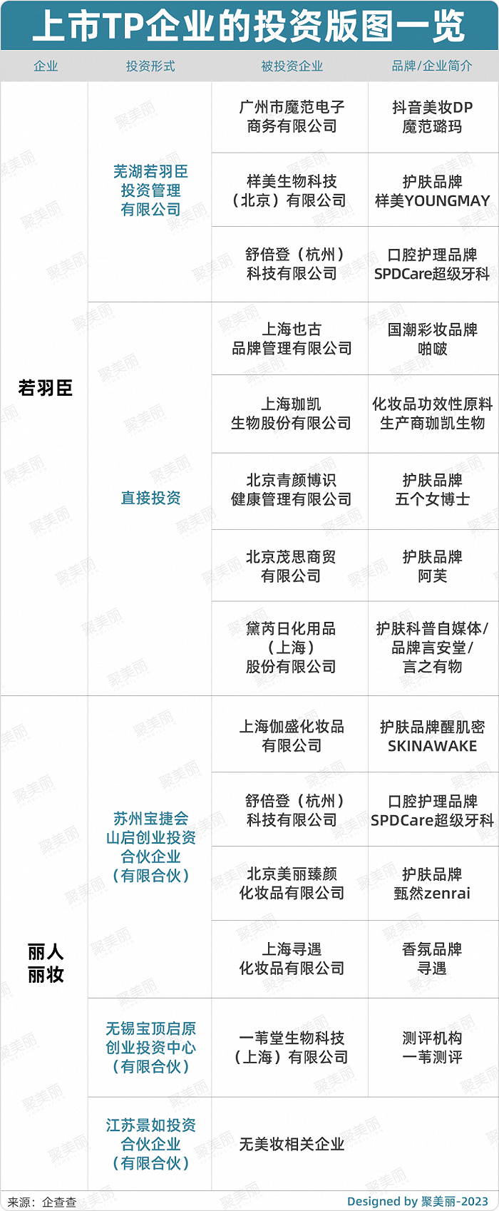 其中,主要以若羽臣和丽人丽妆两家头部代运营商的投资为主,其他虽有布局投资公司,但仍未有美妆相关投资动作。
