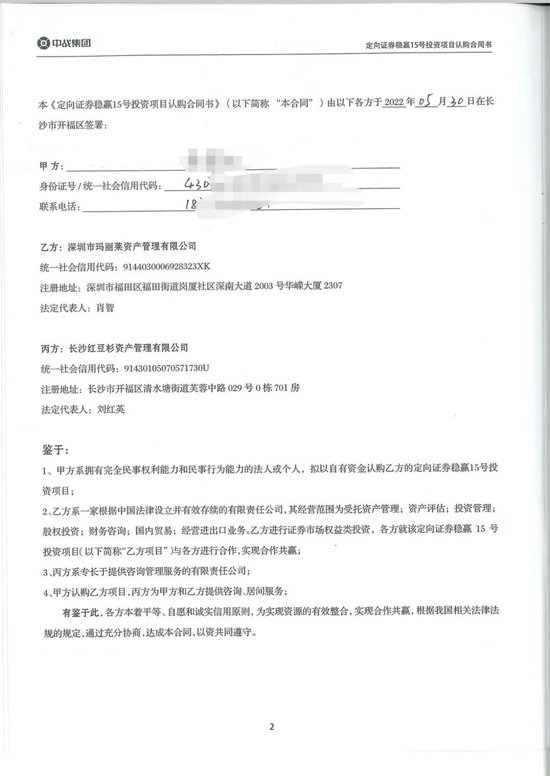 湖南投资者朱娟告诉澎湃新闻,2022年5月,她与深圳市玛丽莱资产管理有限公司和长沙红豆杉资产管理有限公司签订了三方合同,认购了“定向证券稳赢15号投资项目”,投资100万给乙方深圳玛丽莱用于证券市场权益类投资,2年到期,业绩比较基准为15.5%,约定到期总收益为31万元。此合同签订当日还签订了一个补充协议,中战集团对朱娟债权的实现提供无条件不可撤销的连带责任保证。