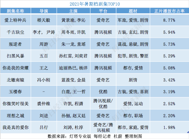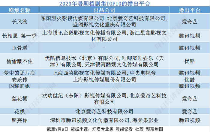 据灯塔专业版,截至8月9日,TOP10的剧集中,腾讯视频一家占据5席,爱奇艺包揽3部,优酷有2部。