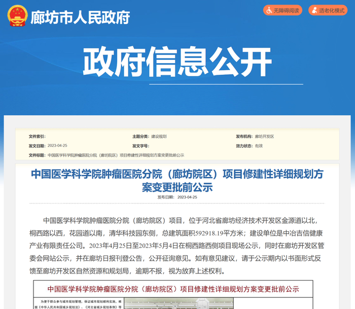 据廊坊市政府今年4月25日的一则信息公开显示,项目名称又变为中国医学科学院肿瘤医院分院(廊坊院区)。