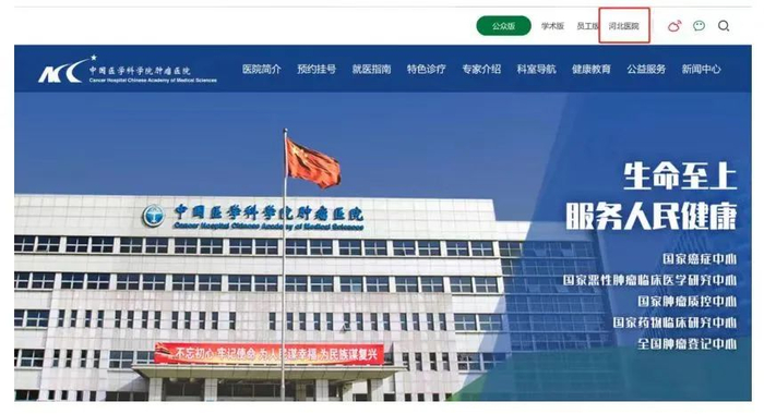 2023年7月份中国医学科学院肿瘤医院官网还有“河北医院”字样。