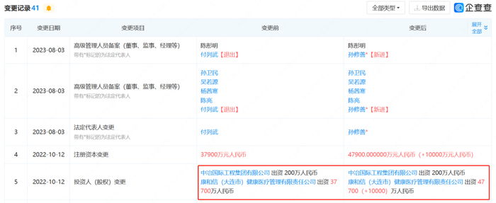 其控股股东为康和信(大连市)健康医疗管理有限责任公司(简称“康和信”),中冶吉信另一股东为中国中冶的全资子公司中冶国际,但持股仅0.42%,并未控股。企查查显示,中冶国际出资时间为2022年10月12日。