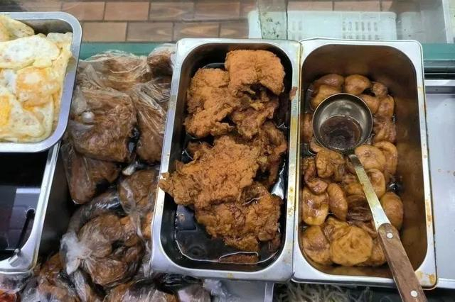 到此,一碗香喷喷的冷面就完成了。冷面的浇头则是锦上添花之物,花式繁多,丰俭由人。对老上海人来说,最正宗的冷面浇头一定是有着绿豆芽的三丝浇头,而丰裕销量最好的浇头则是三丝、面筋、辣酱和大排。