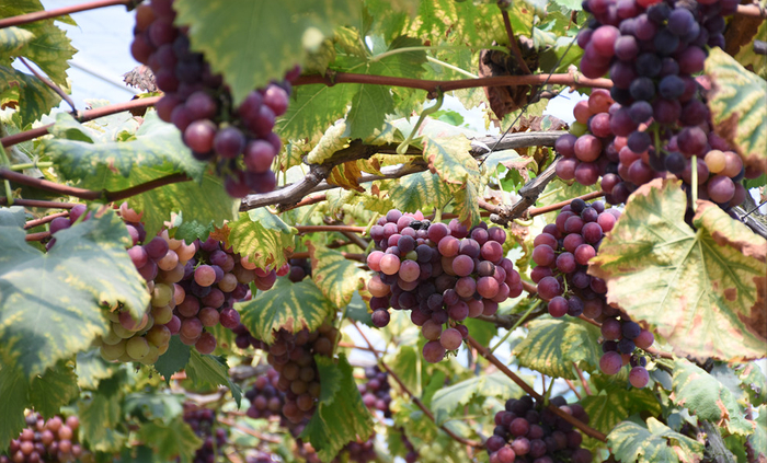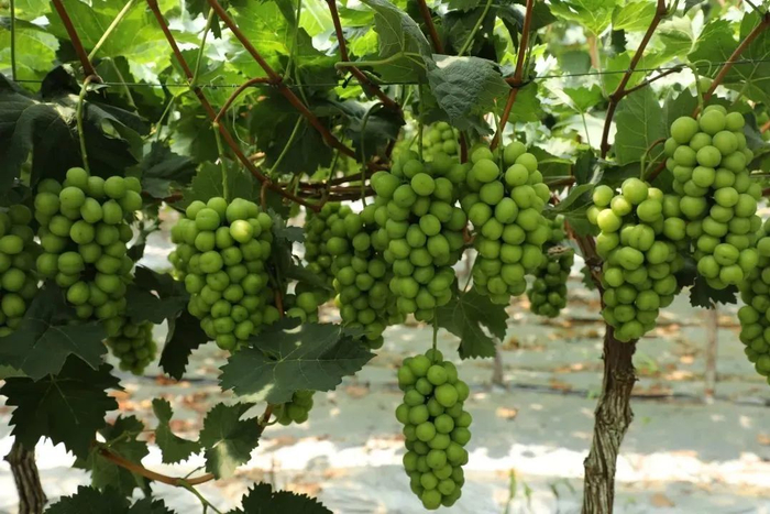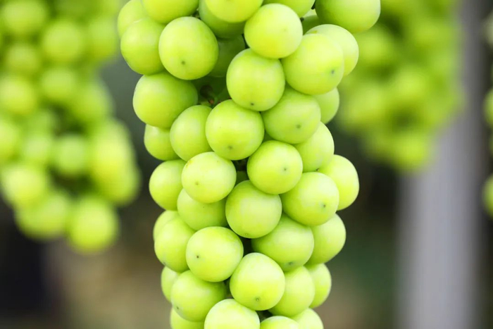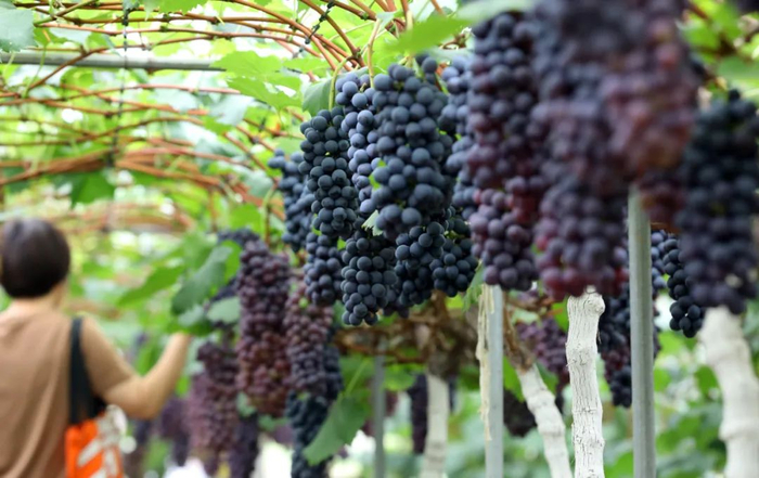 煎茶街道的葡萄一直采用科学有机种植模式,目前有夏黑、阳光玫瑰、白罗莎、红巴拉多、金手指等7个品种,其中最受欢迎的是夏黑。夏黑比其他葡萄要“胖”一些,每一颗果实都如珠似玉,果皮颜色深,单颗果粒较重。