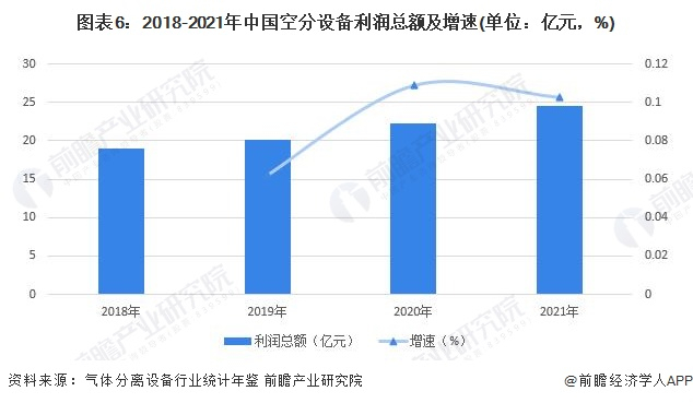 根据气体分离设备行业统计年鉴,我国空分设备利润总额呈现逐年增长的趋势,2020年我国空分设备利润总额达到22.31亿元,增速达10.88%;2021年我国空分设备利润总额提振至24.6亿元,增速为10.26%。我国空分设备技术水平的创新突破使得订单量持续扩容,利润水平逐年攀升。