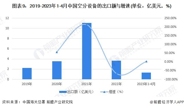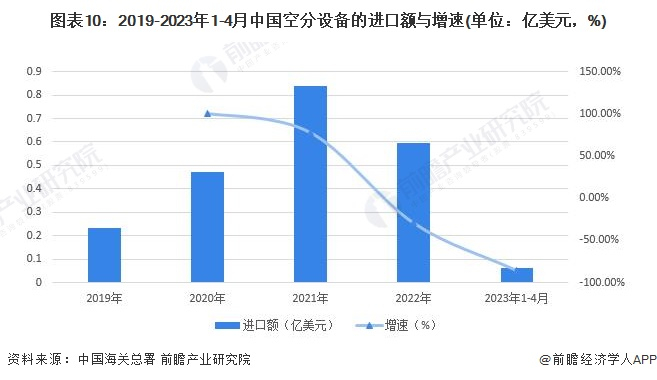 由中国海关总署数据统计可看出,我国空分设备市场进出口呈现较大的贸易顺差,进出口额在2021年达到进出口市场的高峰。数据显示,2019-2023年1-4月,空分设备出口量在2021年激增,达到阈值11.07亿美元,此时增速突破212.71%,达到该阶段的顶峰。2021年后中国空分设备出口额如期回落,2022年缩减至3.65亿美元,同比下降67.03%。进口方面呈现相似的趋势,2021年进口空分设备0.84亿美元,同比增长78.19%,达到极高点;2022年进口空分设备0.60亿美元,同比下降28.81%。2023年1-4月,中国空分设备出口额达1.37亿美元,同比上升2.24%;进口额达0.06亿美元,同比增长85.07%。我国空分设备进口额相对较低,且随着本土企业的技术创新,我国逐渐摆脱对空分设备的进口依赖,以出口市场为主。