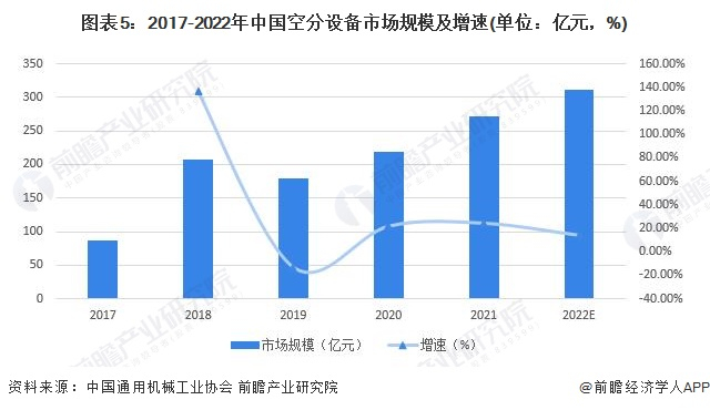 中国通用机械工业协会数据显示,2017年,我国空分设备的市场规模仅87.3亿元;2021年,我国空分设备规模已达到272.5亿元,实现三倍速的增长;初步估计2022年我国空分设备的工业产值达311亿元,同比增长14.13%。