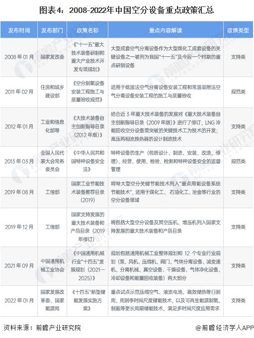 空分设备作为通用设备制造业的重要组成部分,也是国民经济基础性行业的重要支撑装备,其发展离不开政策的支持和推动。“十一五”期间,煤气化燃气-蒸汽联合循环机组等大型高效清洁发电装备等被列为“十一五”后我国装备制造业振兴的重点内容;2019年,工信部发布《国家支持发展的重大技术装备和产品目录(2019年修订)》,其中,将特大型空分关键节能技术列入“重点用能设备系统节能技术”,适用于煤化工、石油化工、冶金等行业的空分设备领域;“十四五”期间,中国通用机械行业对包括通用机械工业整体和12个专业行业(泵、风机、压缩机、阀门、气体分离设备、减变速机、分离机械、真空设备、干燥设备、气体净化设备、冷却设备和能量回收装备)两大部分进行了重点规划。
