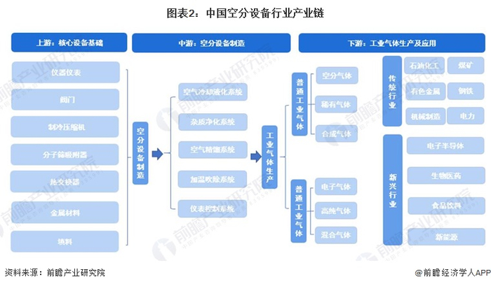 从产业链条来看,上游核心制造设备及原料的供应阶段主要包括仪器仪表、阀门、制冷压缩机、分子筛吸附器、热交换器、金属材料、填料等。中游即空分设备制造,主要包括空气冷却液化系统、杂质净化系统、空气精馏系统、加温吹除系统、仪表控制系统等。下游气体分离、提纯阶段主要的产物为氧气、氮气、氩气等普通工业气体与高纯气体、电子气体等特种气体。