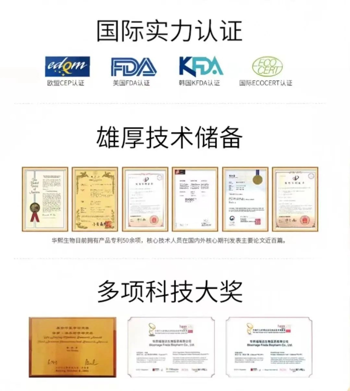 华熙生物目前拥有的产品专利就有50余项,荣获多项科技大奖,且经过欧盟CEP、美国FDA、韩国KFDA等多项国际认证。