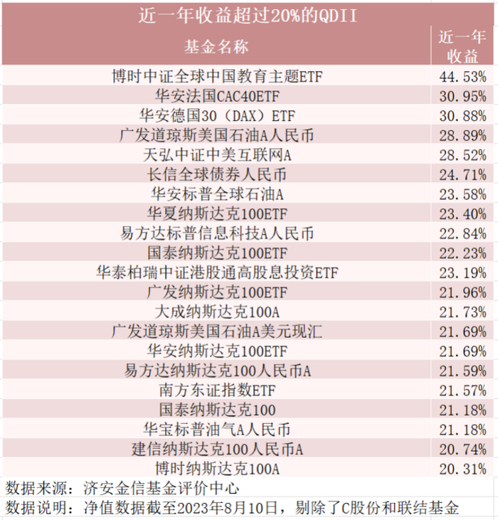 截至目前,共有21只QDII(剔除C份额和联接QDII产品)在近一年取得了超20%的优异业绩。布局法国、德国,以及美国纳斯达克市场、石油产品的QDII均取得了较高涨幅。