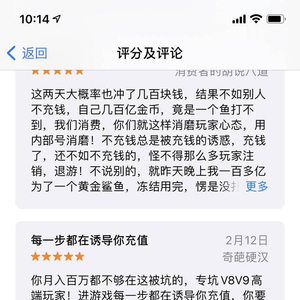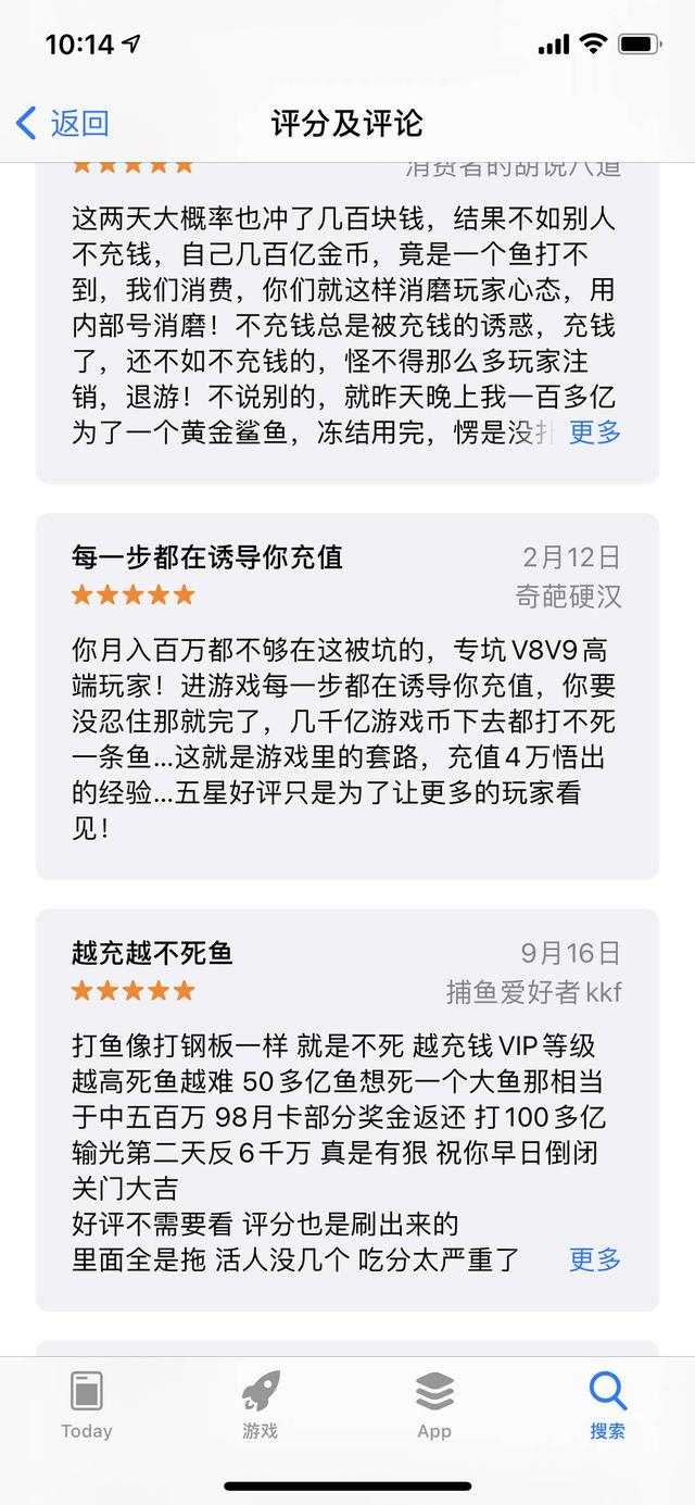 在手机应用商店下方,有网友评论道,“这是一款非常花钱的游戏,不充钱你根本不可能捕到鱼,就算充了钱也分分钟被杀完,而且各种诱导你消费的活动会一直弹出,很容易上头不断充钱”“第一天充了200还玩了5-6个小时才输完,第二天充了500不到2小时输完”“不充钱不爆鱼,充了钱给你一点甜头”。记者下载了该款游戏,打开后发现该游戏的实际年龄要求为17+而并非官方所说的18+,进入游戏时,需要输入姓名及身份证,记者使用了非本人信息,顺利通过,且无任何人脸识别等二次认证要求。
