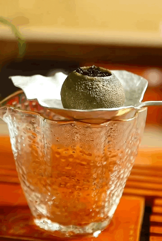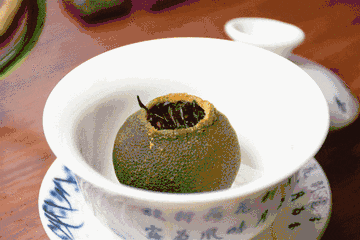 滚烫的开水冲泡在整颗小青柑上,便能一下子激发了小青柑的魔力。