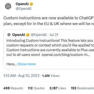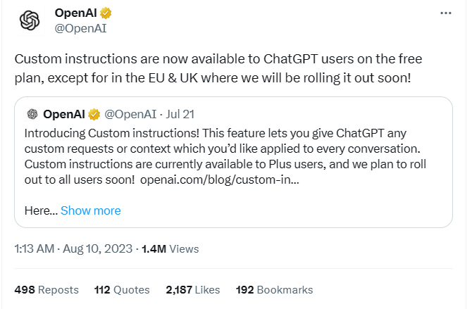 日前,OpenAI公司在社交媒体上发文称,“自定义指令功能正对免费用户开放。”