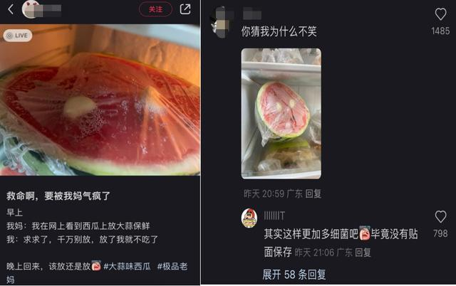 夏季食物不好保存,包上保鲜膜放入冰箱是食物保鲜的常规办法。最近刷到了一些关于保存西瓜的神操作,吃不完的西瓜不仅被包上了保鲜膜,还放了两瓣大蒜,原因是大蒜可以帮西瓜杀菌,这样做能延长西瓜的保质期。