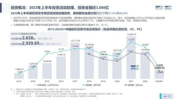最近两年,一级市场肉眼可见地谨慎起来。清科研究中心数据披露,2023年上半年共发生投资案例数3,638起,同比下降37.5%;披露投资金额2,929.65亿元人民币,同比下降42.0%。