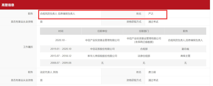 在中信产业基金合规风控负责人方面,《科创板日报》记者看到,负责人为严之,2019年1月-2020年10月在中信证券合规部担任副总裁一职。2020年10月之后,在中信产业基金上担任合规风控负责人、信息填报负责人;更早期,其在新华人寿保险法律合规部做高级主管,而合规风控负责人属于高级管理人员。