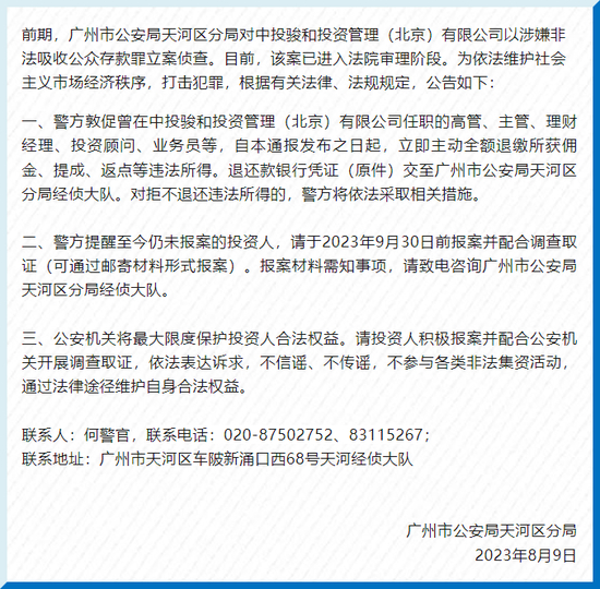 还有公安局通报了这样一个案例。近日,广州市公安局天河区分局在其官微上公布了一起涉嫌非法吸收公众存款案件的最新进展。此前,中投骏和投资管理(北京)有限公司(以下简称“中投骏和”)因涉嫌非法吸收公众存款罪已被广州天河公安立案侦查,目前该案已进入法院审理阶段。