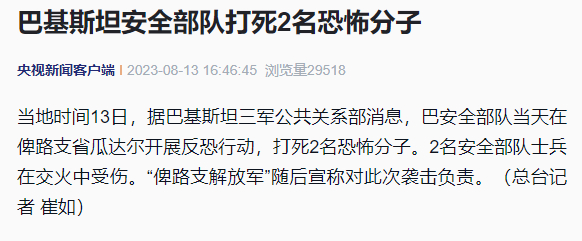 另据央视新闻报道,当地时间13日,巴基斯坦三军公共关系部消息称,巴安全部队当天在俾路支省瓜达尔开展反恐行动,打死2名恐怖分子。2名安全部队士兵在交火中受伤。“俾路支解放军”随后宣称对此次袭击负责。