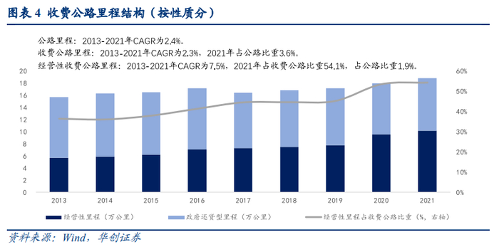 2021年末,全国经营性公路里程10.2万公里,同比+6.1%,2013-2021年8年CAGR为7.5%,占全国收费公路里程从2013年的36.4%提升至2021年的54.1%。相较之下,政府还贷公路里程2013-2021年8年累计缩减13.5%。