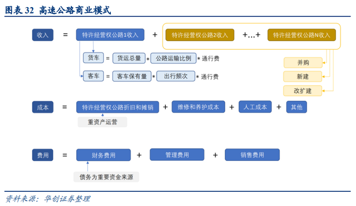 高速公路收入取决于车流量及通行收费标准,成本由折旧摊销、人工成本和公路养护费用组成,财务费用为主要的费用支出。