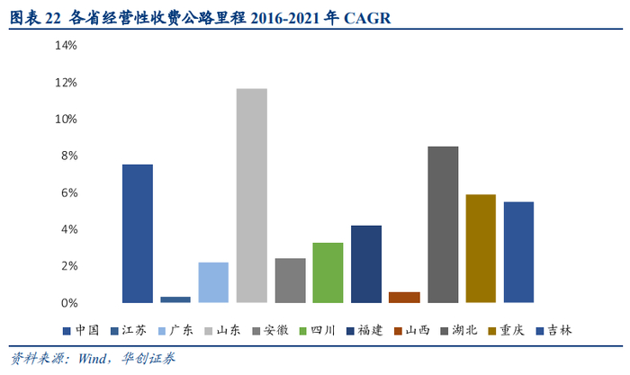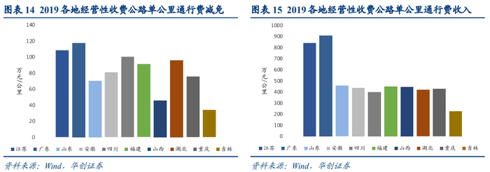 3、区域经济潜能:不同区域公路的盈利能力有差异。综合考虑车流量、费率、通行费减免力度等因素,经营性公路的单公里创收能力上,广东 > 江苏 > 山东 > 福建 > 山西 > 安徽 > 重庆 > 湖北 > 四川 > 吉林。
