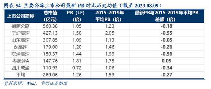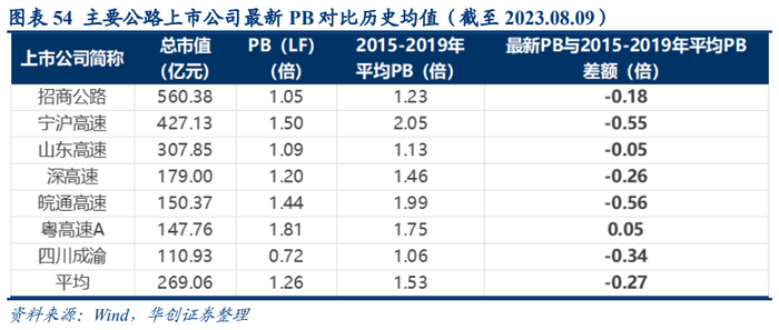 对比现阶段以及稳定经营期间2015-2019年,主要公路上市公司的最新PB与2015-2019年平均PB的差距主要在0.2-0.6倍的区间。7家百亿以上市值的公路公司目前平均PB为1.26倍,较2015-2019年平均PB1.53倍差额将近0.3倍。