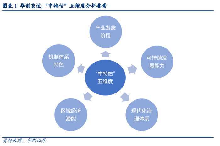 在中期策略报告中,我们提出了华创交运|“中特估”五维度分析要素:即在传统财务分析、估值方式外,增加多元维度分析,包括产业发展阶段、机制体制特色、区域经济潜能、可持续发展能力以及公司治理体系现代化等要素。