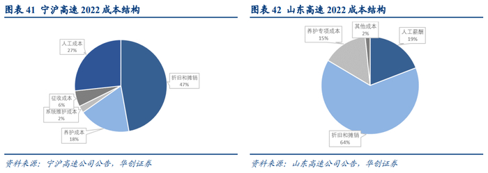 成本端看,折旧和摊销为主要成本。公路的经营成本主要为建设成本、维修成本、养护成本、人工成本等。成本结构中,以固定成本为主,折旧和摊销占比最高,以宁沪高速为例,2022年成本结构中折旧和摊销占比47%,养护和维护成本占比20%。人工成本占比较低,2022年宁沪高速人工成本占比27%,山东高速人工成本占比19%。