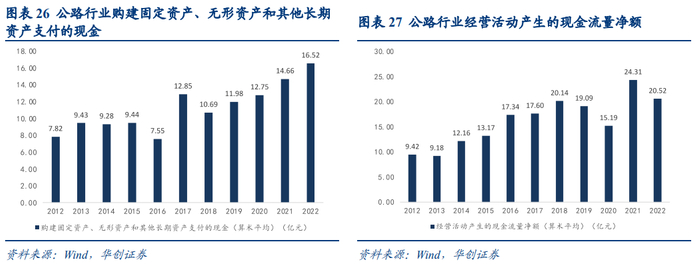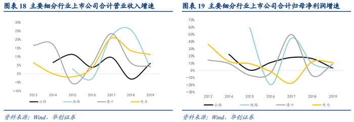 我们对比公路行业以及同样具备基础设施、公用事业性质的其他行业,从2013-2019年期间的上市公司合计营业收入增速和归母净利润增速上看,公路行业的波动显著小于铁路行业、港口行业、电力行业。