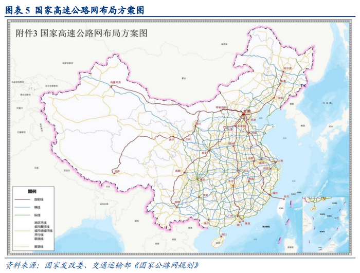 2021年2月《国家综合立体交通网规划纲要》:提出到2035年,基本建成以公路为基础,水运、民航比较优势充分发挥的现代化高质量国家综合立体交通网。其中,立体交通网规划建设公路里程46万公里左右,包括国家高速公路网、普通国道网。国家高速公路网里程16万公里左右,由7条首都放射线、11条纵线、18条横线及若干条地区环线、都市圈环线、城市绕城环线、联络线、并行线组成;普通国道网里程30万公里左右,由12条首都放射线、47条纵线、60条横线及若干条联络线组成。