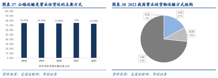 2022年运输货物量中,公路运输占73%,远高于占比第二的水路运输(17%),再次为铁路运输(10%)。“公转铁”自2020年实施以来,倡导运输量从公路向铁路、水路转移,公路货物运输量占比有所下降但整体稳定。公路运输方式具有灵活性高、便捷高效、覆盖广泛和门到门服务的优点,对于规模较小、距离较短的货物运输,公路运输方式可替代性较弱。