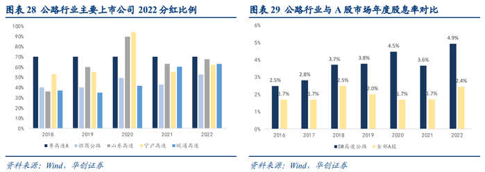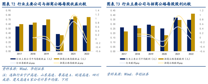 b)央企平台整合优势凸显成长属性。连续多年并购优质路产确保业绩提升,2016-2022年,公路行业主要上市公司营业收入CAGR为7.3%,招商公路为8.6%,高出行业1.3pct;主要上市公司归母净利润CAGR为1.9%,招商公路为8.8%,高出行业6.9pct。