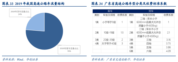 收入端,车流量端看,2019年我国高速公路车流量为102.4亿辆,其中客车流量占比76%,货车流量占比24%。