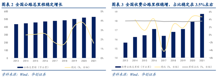 近年来,收费公路里程占公路总里程比重稳定在3.5%附近。根据交通运输部数据,截至2021年末,我国公路里程为528万公里,同比+1.6%,2013-2021年8年CAGR为2.4%,保持平稳增长。其中,收费公路里程18.8万公里,占总里程的3.6%,2013-2021年8年CAGR为2.3%。
