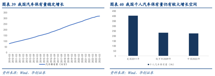 消费升级预计带动汽车保有量和出行频次增加。2022年我国汽车保有量达到3.19亿辆,5年CAGR为8%,保持较快增长。2022年我国千人汽车保有量为226量(俄罗斯2008年千人汽车保有量亦达到226量),美国2011年千人汽车保有量已达到403量,我国汽车保有量仍有较大的提升空间。预计未来持续受益于消费升级,我国汽车保有量和居民出行频次仍将保持稳定增长的趋势。