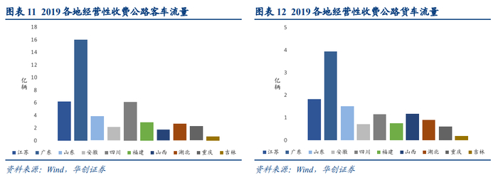 我们选取2019年交通运输部数据,对江苏(宁沪高速)、广东(深高速、粤高速、东莞控股)、山东(山东高速)、安徽(皖通高速)、四川(四川成渝)、福建(福建高速)、山西(山西路桥)、湖北(楚天高速)、重庆(重庆路桥)、吉林(吉林高速)等含有公路上市公司的10个省份/直辖市进行比较。