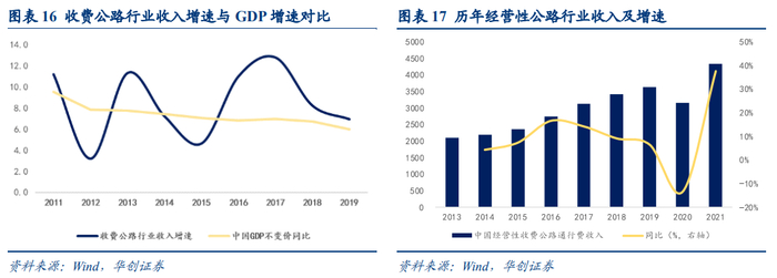 收费公路收入整体呈增长态势且增速整体高于GDP增速,具有一定的需求韧性。2011-2019年收费公路行业收入平均增速为8.5%,同期GDP不变价平均增速为7.4%。从2013年至今,经营性收费公路行业收入仅在2020年出现下滑,其余年份均保持稳定增长,2021年收入同比+38%达到4323亿元。