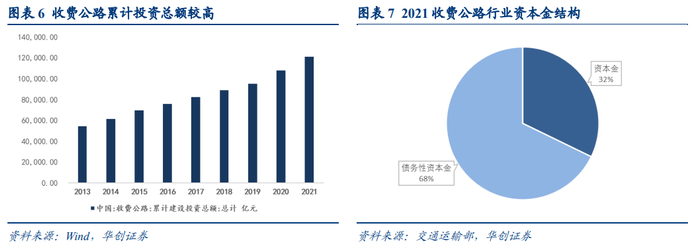 资本结构上,债务资金为重要来源。2021年债务性资本金在收费公路行业资本金中占比68%。在非流动资产占总资产比例上,高速公路行业上市公司占比84%,而全A股合计仅占比48%。