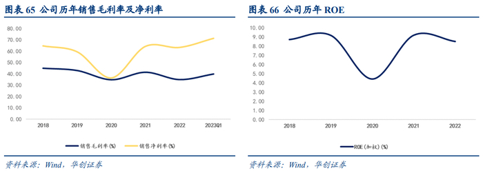 盈利能力稳定在高水平。2022年,公司实现毛利率35.1%,净利率63.3%,ROE8.5%。除2020年出现阶段性波动外,公司毛利率、净利率、ROE分别维持在40%、65%、9%附近的高水平。