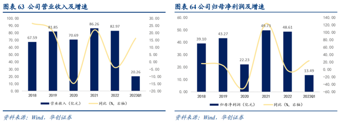 2022年,公司实现营收83.0亿元,同比下滑3.8%,2017-2022年CAGR为9.2%;实现归母净利润48.6亿元,同比下滑2.3%,2017-2022年CAGR为7.6%。2023年一季度,公司实现营收20.3亿元,同比增长16.3%;实现归母净利润13.5亿元,同比增长23.6%。