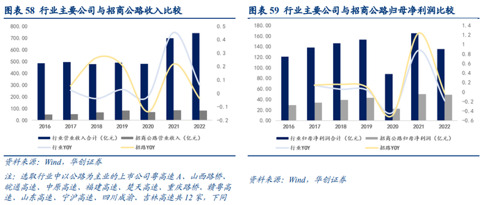 2016-2022年,公路行业主要上市公司营业收入CAGR为7.3%,招商公路为8.6%,高出行业1.3pct;主要上市公司归母净利润CAGR为1.9%,招商公路为8.8%,高出行业6.9pct。